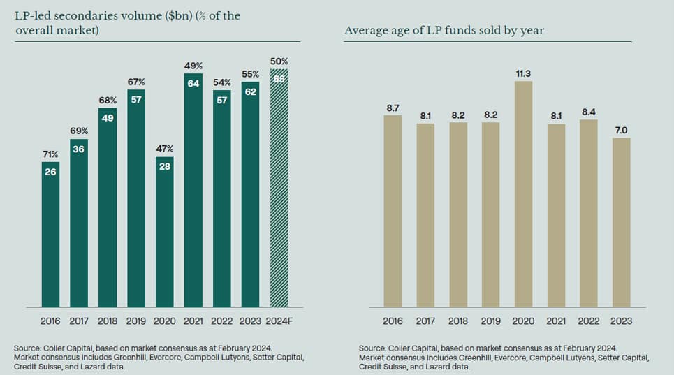 The secondary market was originally created to support the sale and purchase of limited partner interests in individual private market funds or portfolios of funds. Whilst the wider secondary market has evolved to encompass other transaction types, LP portfolio transactions continue to represent around half of annual transaction volume. In 2023, LP-led volume was $62bn, over half of the full year total. In 2024 the secondary market is expected to be slight more balances, with LP-led transactions estimated to constitute 50% of the market.